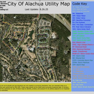 Once an underground survey is complete, we offer a mapping. Although we are not a surveying firm, we use software that connects to GIS for help with accuracy in our maps. We offer both PDF and CAD style maps along with aerial drone photos that we label with street names, direction the drone is facing when the photo is taken, and even house numbers nearby to give further reference.